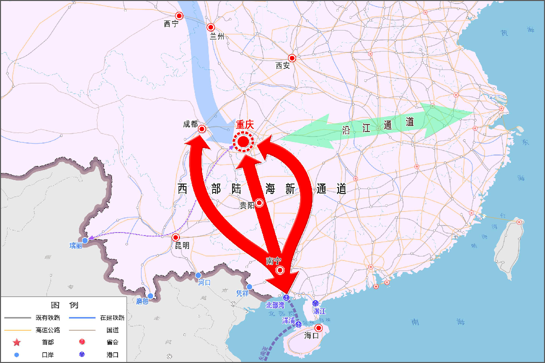 重要樞紐。著力打造國際性綜合交通樞紐,充分發(fā)揮重慶位于“一帶一路”和長江經(jīng)濟(jì)帶交匯點(diǎn)的區(qū)位優(yōu)勢,建設(shè)通道物流和運(yùn)營組織中心;發(fā)揮成都國家重要商貿(mào)物流中心作用,增強(qiáng)對(duì)通道發(fā)展的引領(lǐng)帶動(dòng)作用。建設(shè)廣西北部灣國際門戶港,發(fā)揮海南洋浦的區(qū)域國際集裝箱樞紐港作用,提升通道出??诠δ?。