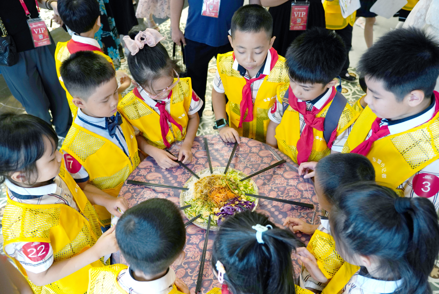 在馬來西亞館,東盟“小記者”們在現(xiàn)場親身體驗了地道的東南亞華人傳統(tǒng)習(xí)俗——“撈生”儀式,即把裝在盤子里的食材用筷子反復(fù)高高夾起,“撈”得越高,寓意越吉祥。通過趣味“撈生”,寄語孩子們學(xué)習(xí)更上一層樓、德智體美勞全面發(fā)展的美好愿望。
